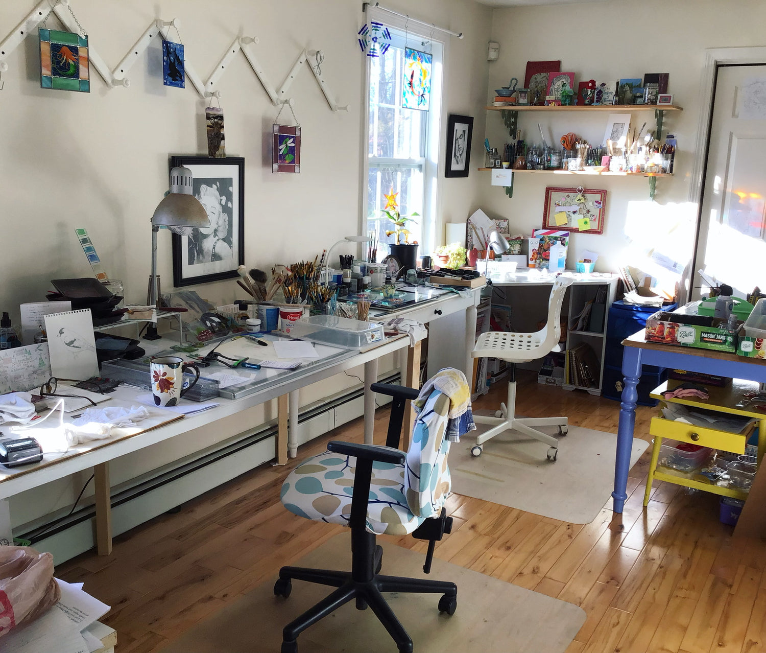 I live in the small village of Chepachet, Rhode Island. All of my original glass paintings are done here, in my home studio, down the street from my co-owned brick and mortar shop, The Hen House. My work is for sale in the shop along with many other local creatives we've gathered throughout New England. We are nestled in the northern corner of the state between Massachusetts and Connecticut.